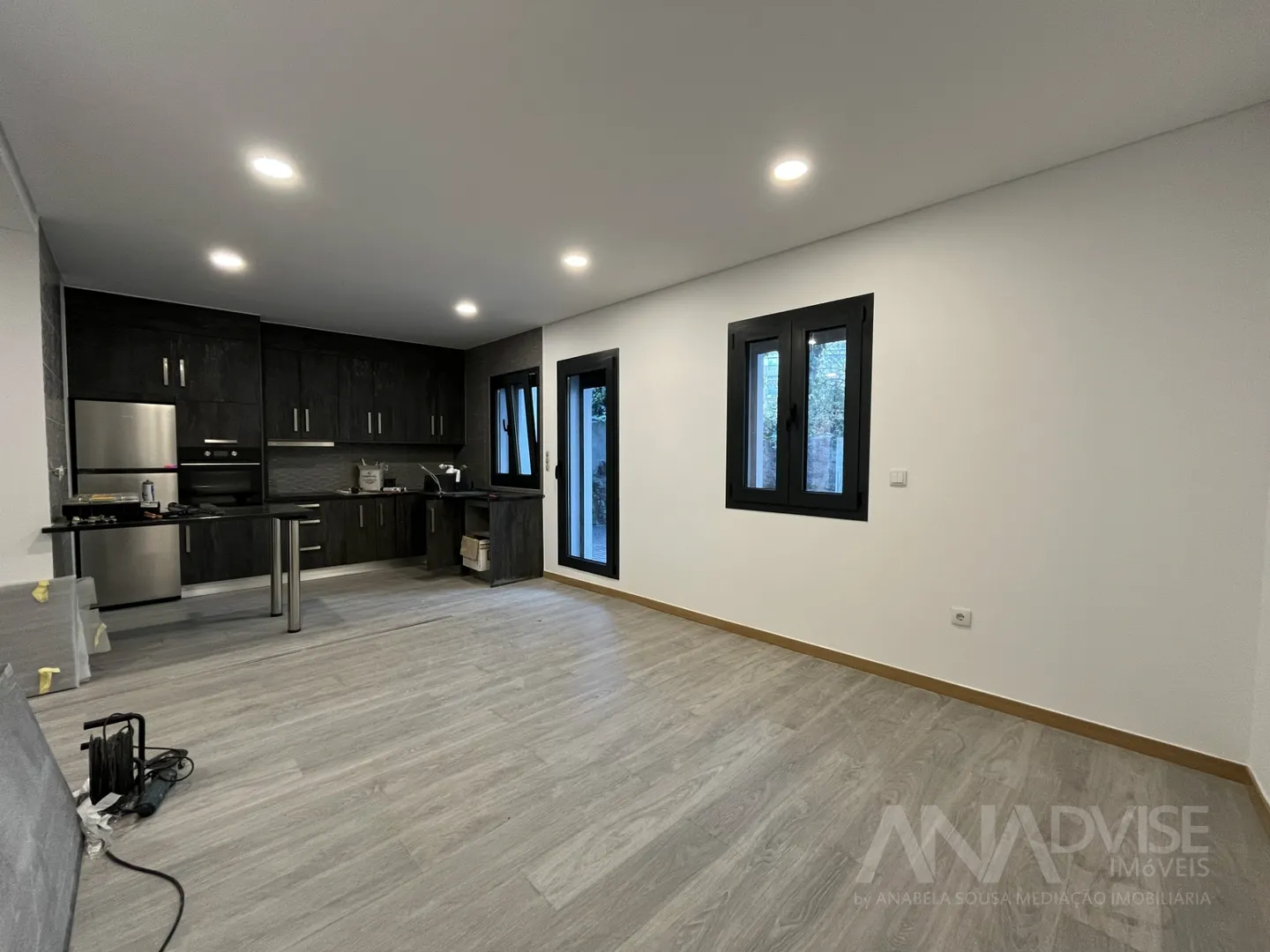 A zona social é composta por uma sala e cozinha em open space, equipada com placa, forno, exaustor e frigorífico combinado.