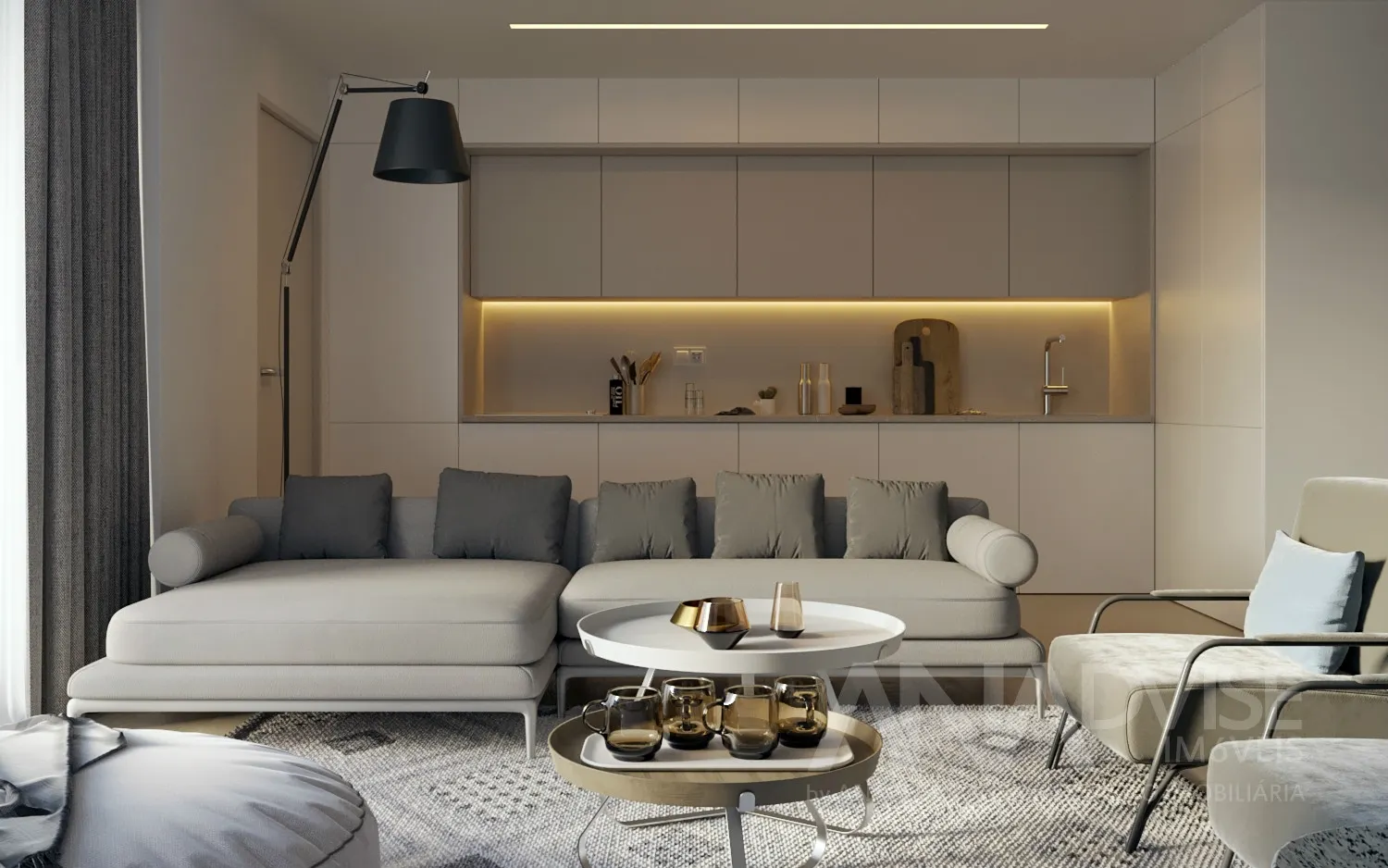 Apartamentos em construção com sala e cozinha open space, placa, forno e exaustor. Ar condicionado e painel solar complementam o conforto térmico do apartamento.