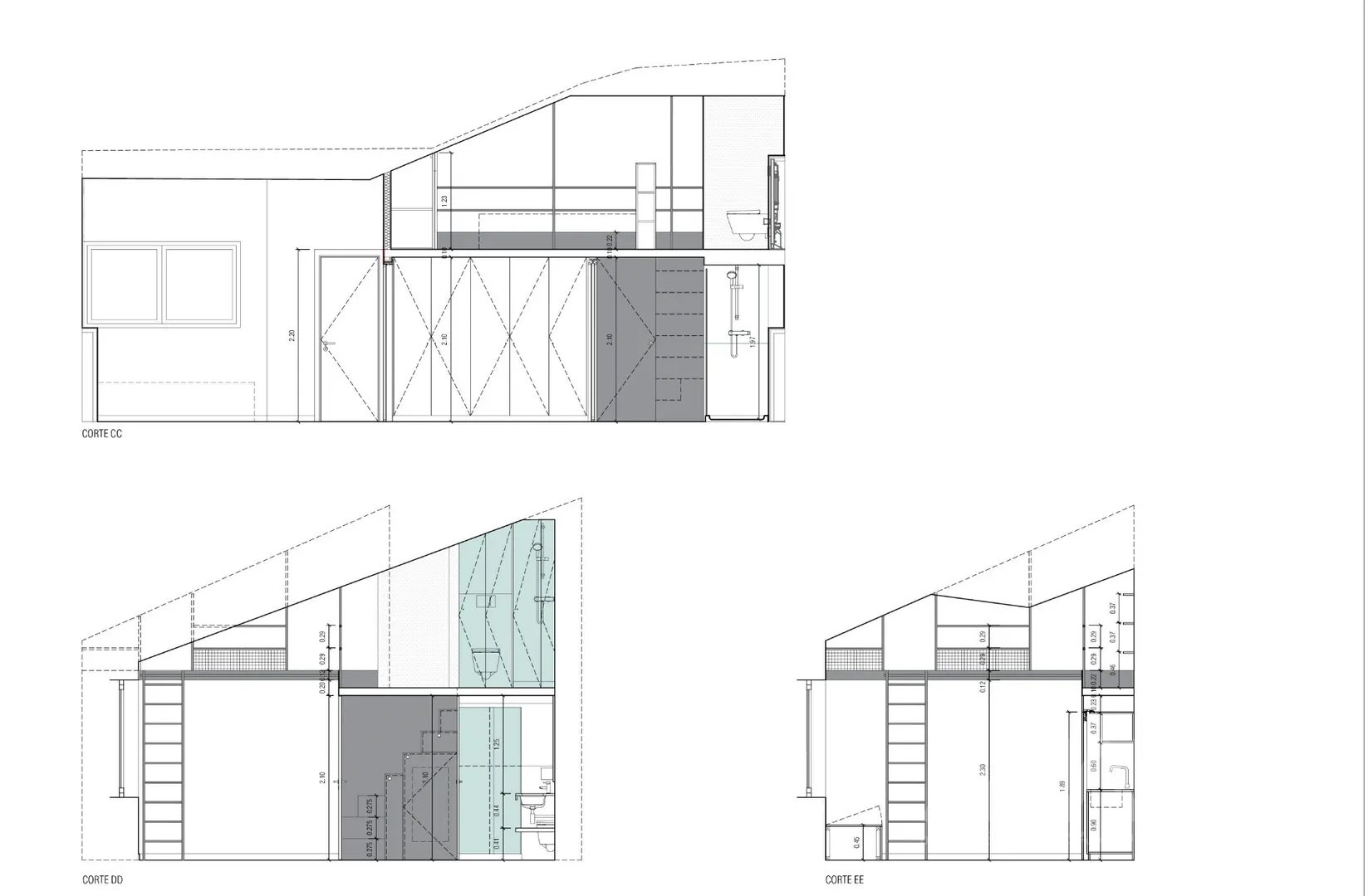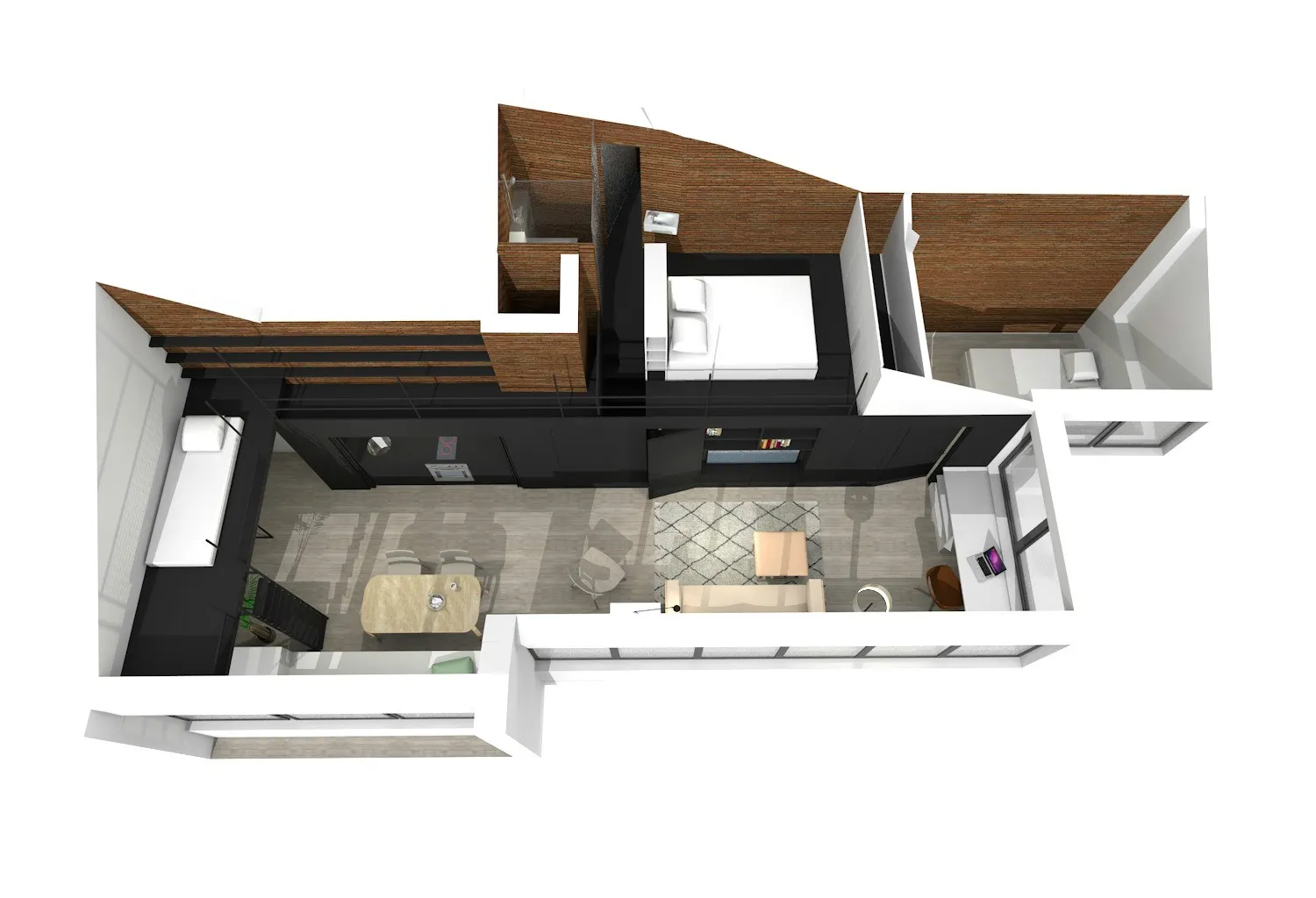 - Projet étudié et élaboré pour un appartement de 2 chambres en format studio, en tirant le meilleur parti de tout l’espace et en ajoutant de la surface utile avec la mise en œuvre de deux chambres à l’étage.