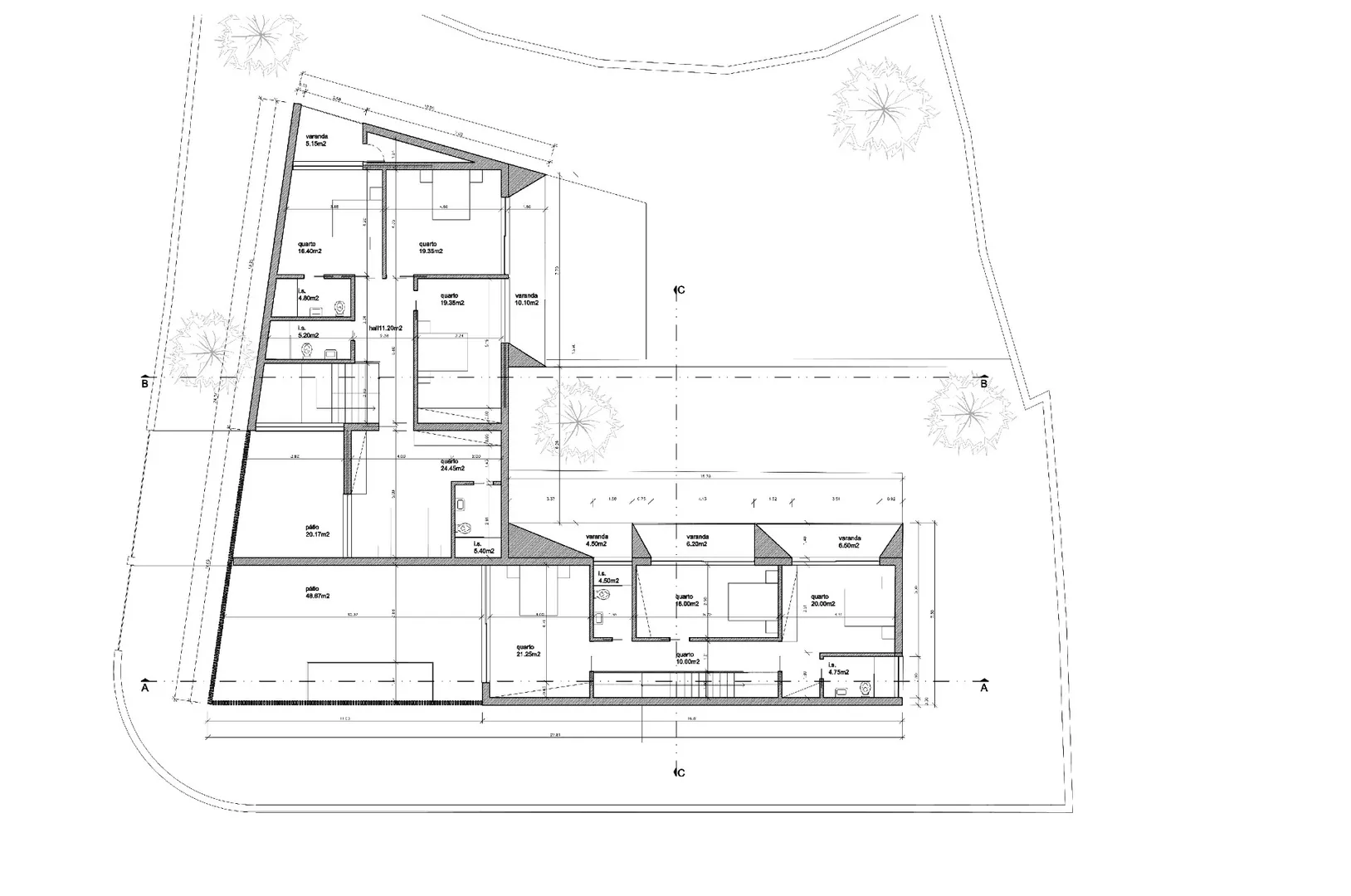 No 1º andar tem 2 quartos com roupeiros com varanda e duas suites com closet ( com 24.25 e 16.40m2) também com uma varanda tipo terraço.
