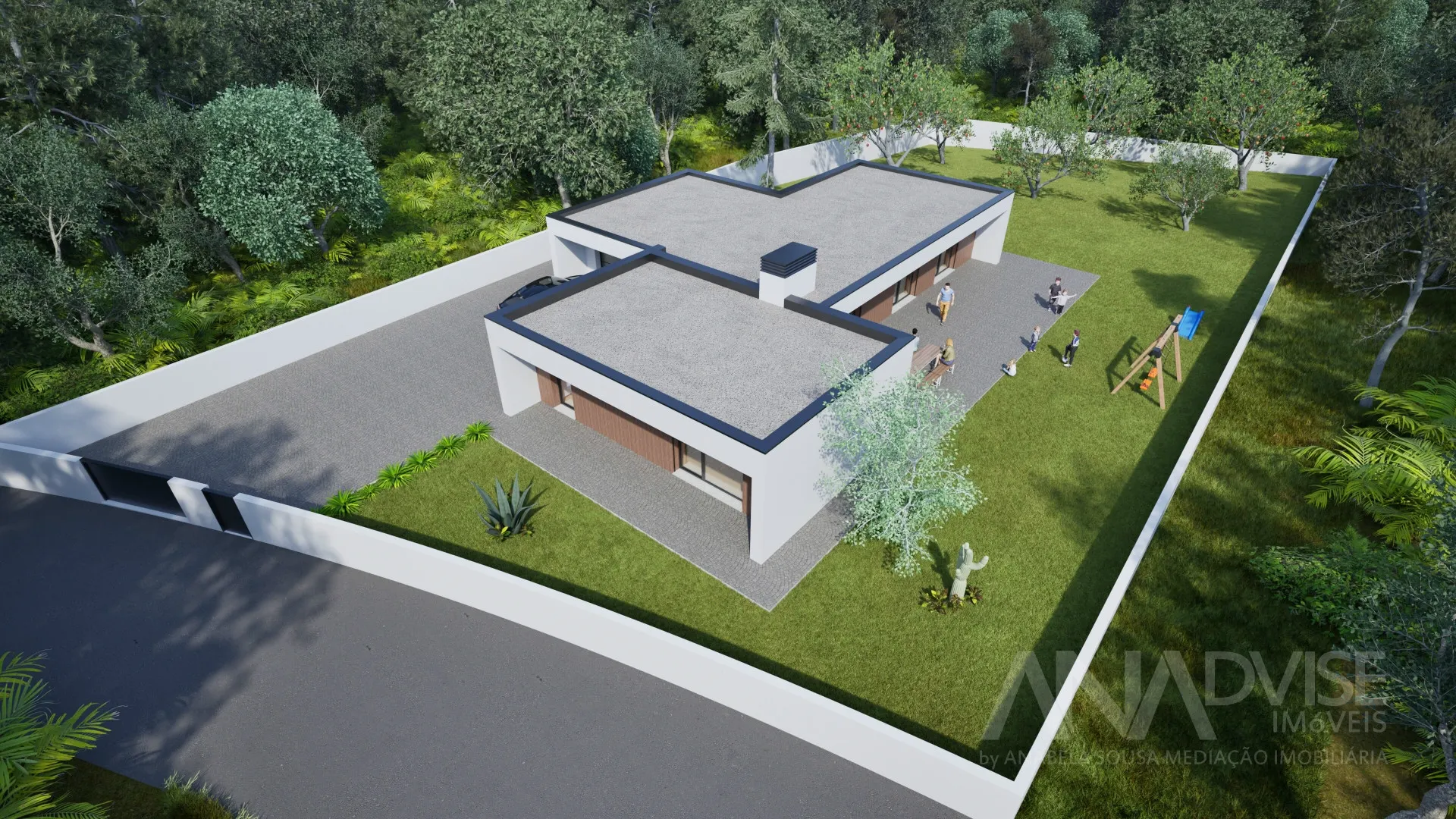 No exterior, a moradia dispõe de terreno totalmente murado, portões motorizados e arranjos exteriores em calçada de granito, garantindo privacidade e um enquadramento exterior harmonioso .