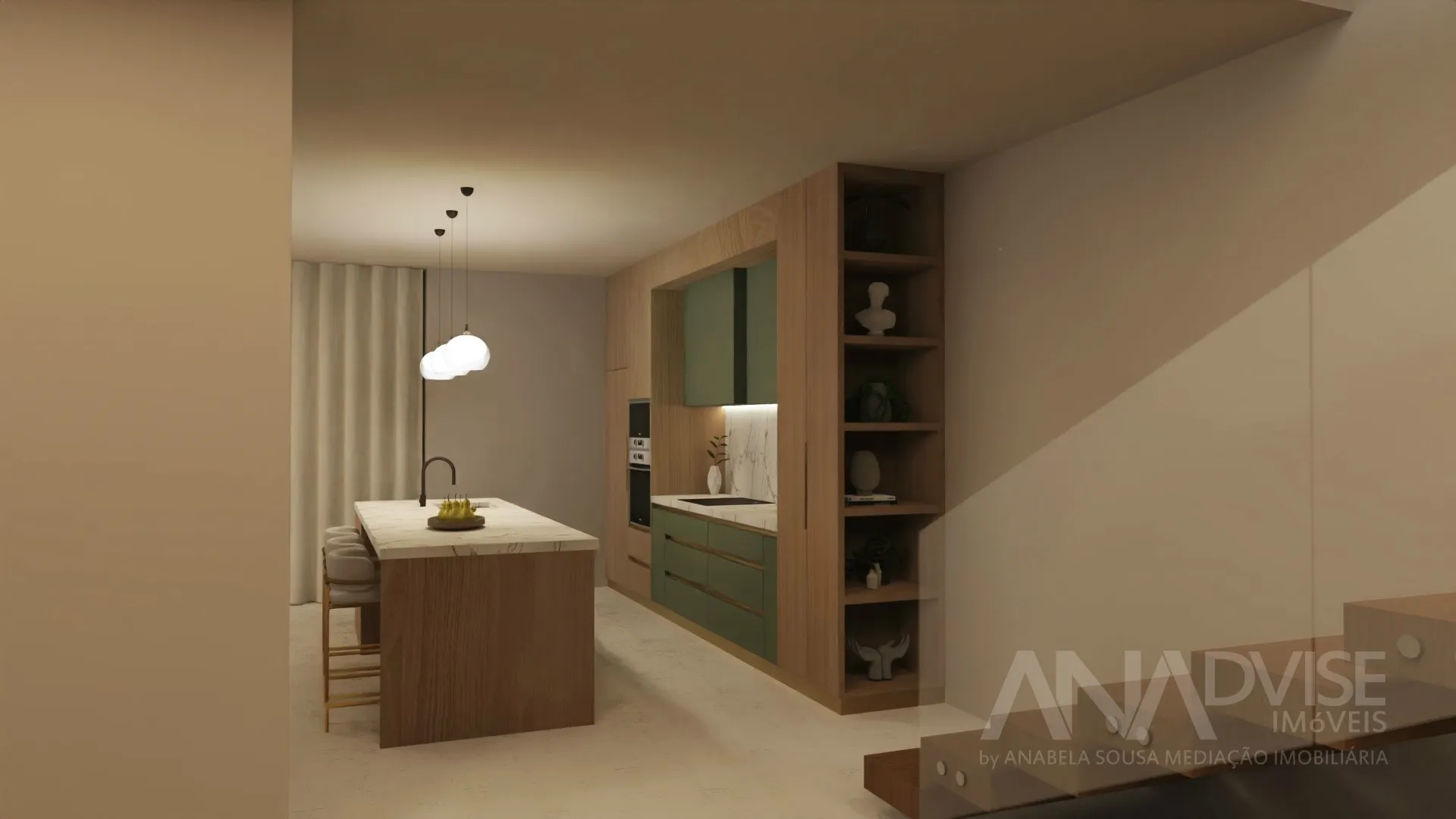 Dispõe de três suítes — uma delas com closet — escritório, ampla sala e cozinha em open space, lavandaria e casa das máquinas.